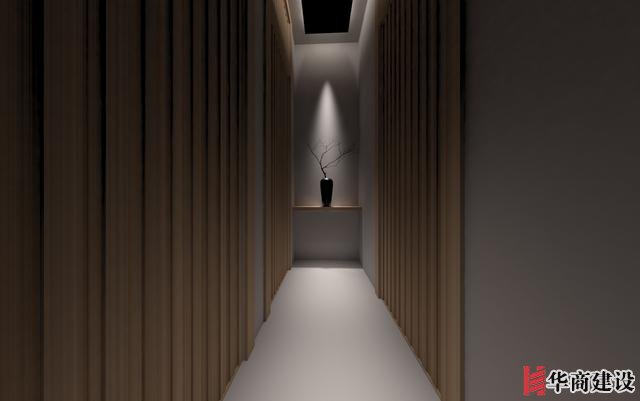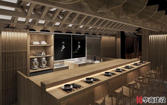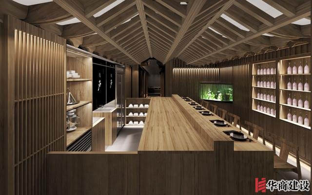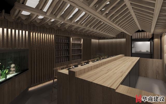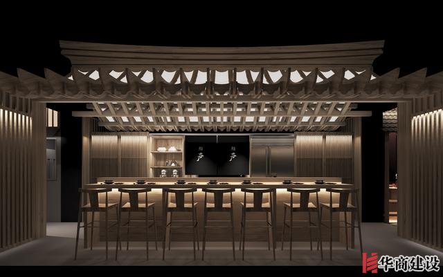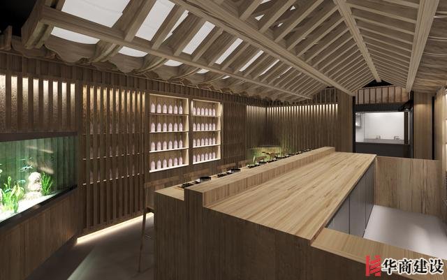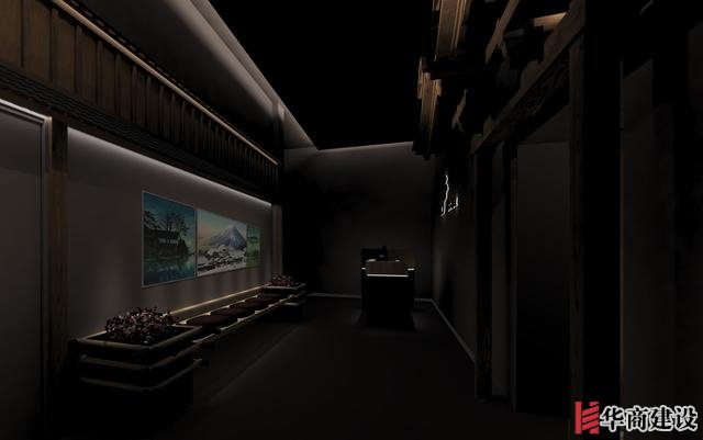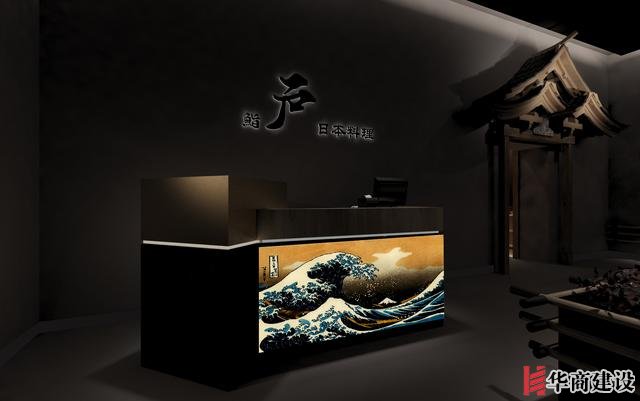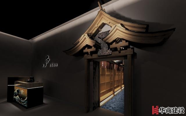 本案在設計中利用該店狹長的特點將日本建筑理念融入餐廳空間設計,創(chuàng)作出日本胡同的延伸感。整體設計以日本原生文化為基調,在空間裝飾上以木制材料為主,配以青石、屋檐、壁畫、雕塑營造出濃郁日本文化和古樸自然之美。而屋脊端頭鬼瓦的裝飾看似不經意,卻最能襯托出日式“精致”之感,在餐廳入口處設置流動氣息的水池,代表著靜中有動的生命力,與整體沉穩(wěn)內斂的基調形成對比。