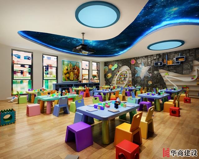 這是一個魔術教室,提到魔術我們想到最多的就是神秘,所以整體的元素設計是以天空為主題,因為人們對于天空也是充滿幻想的,它在人們的心中也是非常神秘的,在色彩的設計上也是五彩斑斕的,因為多彩的顏色可以激發(fā)孩子的好奇心,讓孩子們在這里可以盡情的發(fā)揮自己的想象。