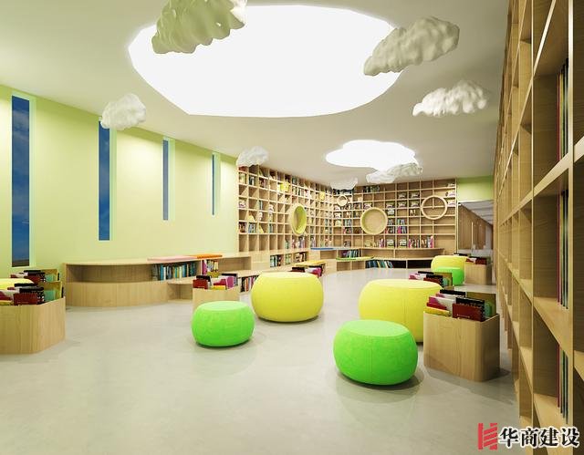 這里是孩子的閱讀室,這里有很多的書籍,孩子們可以盡情的翻閱,天花板上還設置了幾朵白云,整體的設置也是很隨意,不會讓孩子們感受到讀書帶來壓迫感。