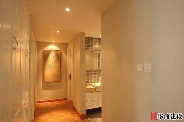 這邊的過道和客廳一樣,沒有頂燈就有小筒燈,衛(wèi)生間做成三段分離,外面是洗漱臺,里面是淋浴間,設(shè)計在過道邊上用起來更方便。