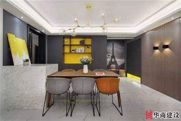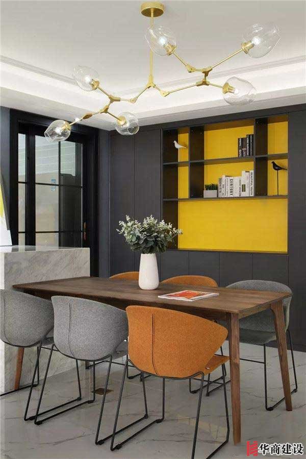 入戶即見(jiàn)餐廳,餐桌與島臺(tái)相連,后方系統(tǒng)柜作背景,亮黃色與深色柜體凸顯層次與跳躍感。