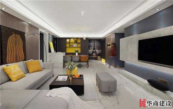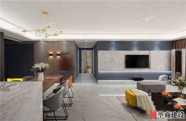 客廳地面通鋪淺色仿大理石紋路瓷磚,與極簡(jiǎn)無(wú)主燈吊頂,構(gòu)成寬敞大氣的公領(lǐng)域空間。