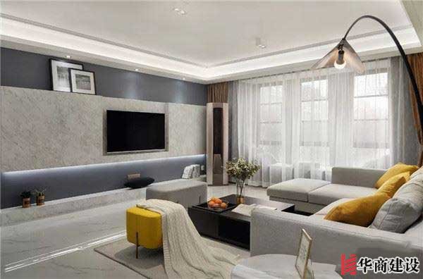 灰色電視背景,中間加入天然石材與燈光打造出飾帶效果,讓空間簡(jiǎn)潔又高端。