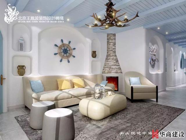 客廳背景墻上船錨裝飾與整體空間相得益彰,仿佛置身藍(lán)色海洋